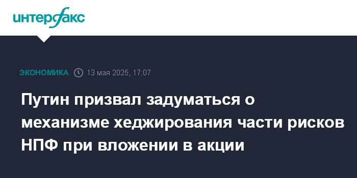 Москва. 13 мая. INTERFAX.RU - Президент РФ Владимир Путин поручил правительству вместе с Банком России и своей администрацией продумать инструмент, который позволил бы снять с негосударственных пенсионных фондов (НПФ) часть рисков при инвестировании средств клиентов в акции.