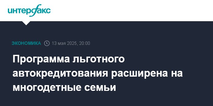 Москва. 13 мая. INTERFAX.RU - Программа льготного автокредитования с 13 мая расширена на семьи, имеющие трех и более детей. Как сообщил Минпромторг РФ, скидка по подпрограмме "Семейный автомобиль" составит 10% от стоимости автомобиля.