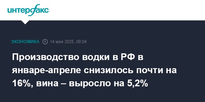 Производство водки в РФ в январе-апреле снизилось почти на 16%, вина – выросло на 5,2%