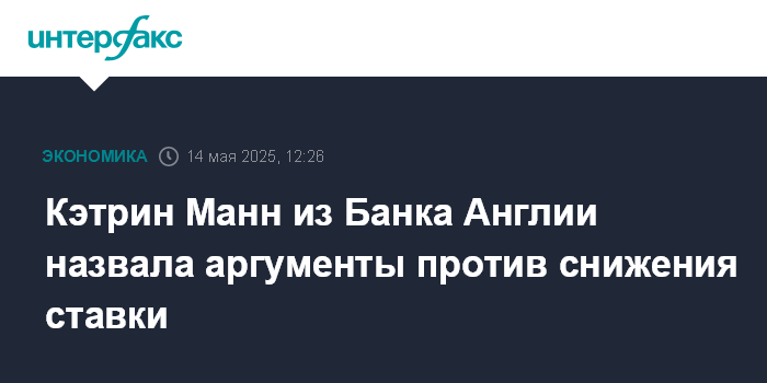 Москва. 14 мая. INTERFAX.RU - Сильные данные по рынку труда США и ускорение роста цен на товары стали причиной, по которой член Комитета по денежно-кредитной политике (MPC) Банка Англии Кэтрин Манн не поддержала снижение ключевой процентной ставки на майском заседании. 8 мая Банк Англии опустил ставку на 25 б.п. до 4,25%.