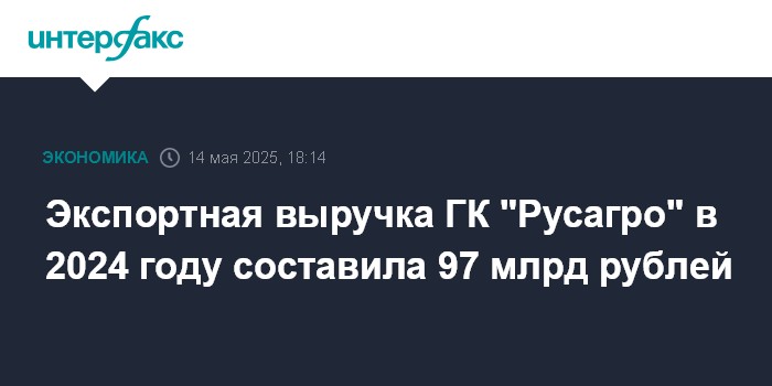 Москва. 14 мая. INTERFAX.RU - ГК "Русагро", один из ведущих агрохолдингов, экспортировала в 2024 году продукции на 97 млрд рублей, сообщается в годовом отчете компании.