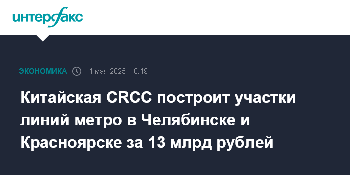 Китайская CRCC построит участки линий метро в Челябинске и Красноярске за 13 млрд рублей