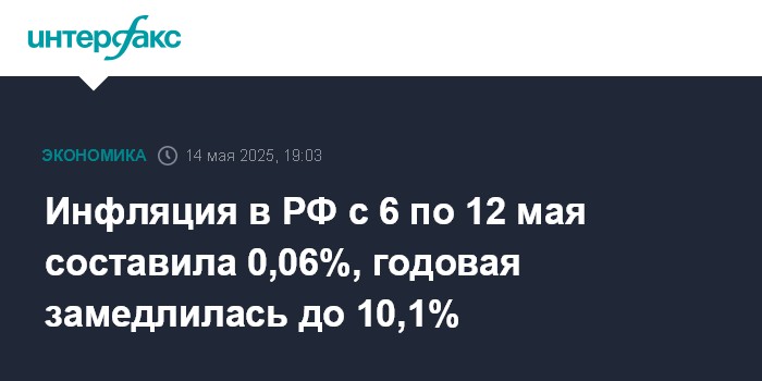 Москва. 14 мая. INTERFAX.RU - Инфляция в РФ с 6 по 12 мая 2025 года составила 0,06% после 0,03% с 29 апреля по 5 мая, 0,11% с 22 по 28 апреля, 0,09% с 15 по 21 апреля, 0,11% с 8 по 14 апреля и 0,16% с 1 по 7 апреля, сообщил в среду Росстат.