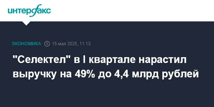 Москва. 15 мая. INTERFAX.RU - Выручка АО "Селектел" (Selectel, провайдер IT-инфраструктуры) в I квартале 2025 года составила 4,4 млрд рублей, что на 49% больше, чем за аналогичный период 2024 года, сообщила компания.
