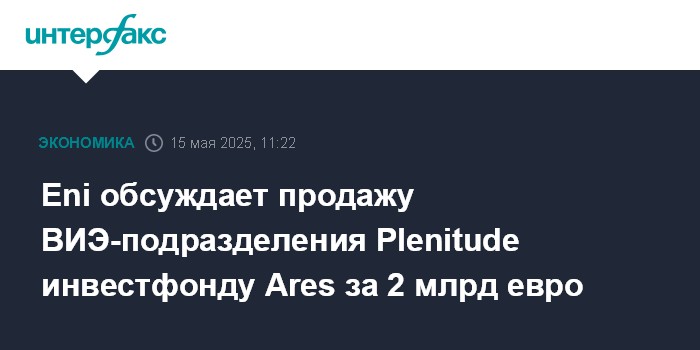 Москва. 15 мая. INTERFAX.RU - Итальянская нефтегазовая компания Eni SpA начала эксклюзивные переговоры о продаже 20% в подразделении Plenitude, специализирующемся на низкоуглеродной энергии, американскому инвестфонду Ares Alternative Credit Management. Сумма сделки может составить около 2 млрд евро, сообщила пресс-служба Eni.