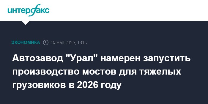 Москва. 15 мая. INTERFAX.RU - "Автомобильный завод "Урал" (Миасс, Челябинская область) планирует запустить серийное производство мостов для тяжелых грузовиков в начале 2026 года, открыл два участка по выпуску комплектующих. Об этом сообщила пресс-служба Фонда развития промышленности (ФРП, предоставило льготные займы для проекта) со ссылкой на генерального директора автозавода Павла Яковлева.