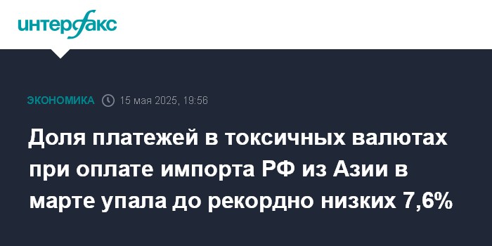 Москва. 15 мая. INTERFAX.RU - Доля платежей в валютах недружественных стран при оплате импортных поставок в РФ из стран Азии товаров и оказания услуг в марте 2025 года упала до рекордно низких 7,6%. Это следует из данных ЦБ РФ о валютной структуре внешнеторговых расчетов.