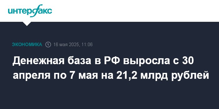 На 30 апреля денежная база в России равнялась 18 132,7 млрд рублей. Таким образом, за период она выросла на 0,12%, или на 21,2 млрд рублей.