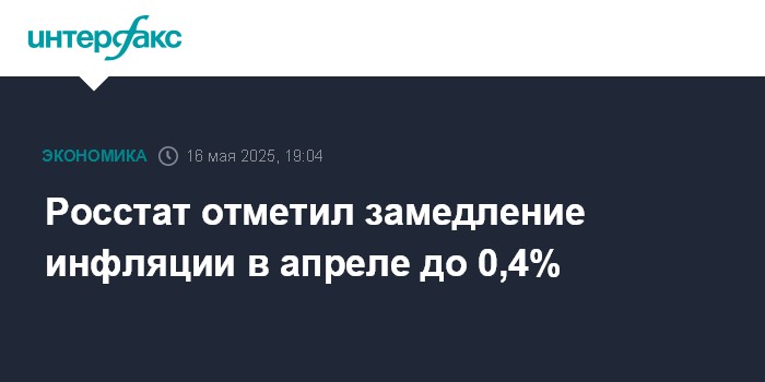 Москва. 16 мая. INTERFAX.RU - Инфляция в России в апреле 2025 года составила 0,4% после 0,65% в марте, 0,81% в феврале и 1,23% в январе, сообщил Росстат.