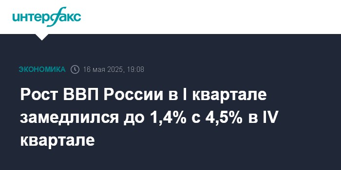 Москва. 16 мая. INTERFAX.RU - В I квартале 2025 года российская экономика выросла на 1,4% в годовом исчислении, по предварительной оценке Росстата.