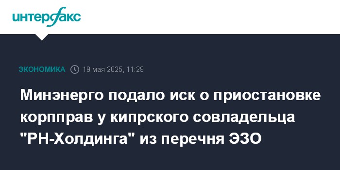 Минэнерго подало иск о приостановке корпправ у кипрского совладельца "РН-Холдинга" из перечня ЭЗО