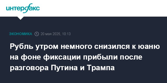 Рубль утром немного снизился к юаню на фоне фиксации прибыли после разговора Путина и Трампа