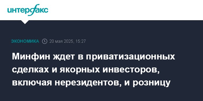 Москва. 20 мая. INTERFAX.RU - Минфин РФ рассчитывает на достаточный интерес к приватизируемым активам как со стороны якорных инвесторов, так и со стороны розницы, сообщил замглавы ведомства Алексей Моисеев.
