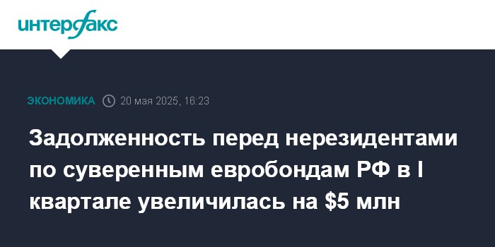 Москва. 20 мая. INTERFAX.RU - Объем задолженности по суверенным еврооблигациям РФ перед нерезидентами в первом квартале 2025 года увеличился на $5 млн, или на 0,05%, до $9,102 млрд с $9,097 млрд, сообщается на сайте ЦБ РФ.