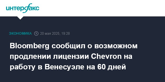 Москва. 20 мая. INTERFAX.RU - Администрация президента США Дональда Трампа готова продлить срок действия лицензии, выданной Chevron Corp. на добычу и экспорт нефти из Венесуэлы, еще на 60 дней на фоне переговоров с президентом страны Николасом Мадуро о депортации нелегальных мигрантов и судьбе арестованных в стране американцев, передает Bloomberg со ссылкой на источники.