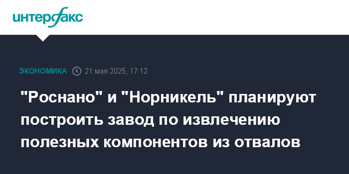 Москва. 21 мая. INTERFAX.RU - "Роснано" и "Норникель" планируют начать строительство совместного завода по извлечению полезных компонентов из отвалов.
