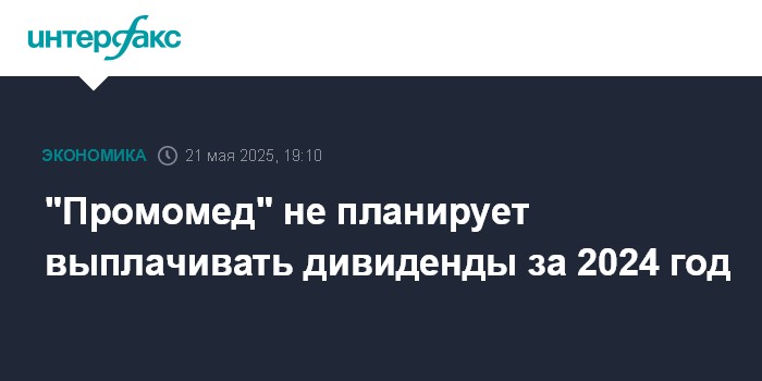 Москва. 21 мая. INTERFAX.RU - Совет директоров ПАО "Промомед" рекомендовал акционерам на годовом собрании 24 июня принять решение не выплачивать дивиденды за 2024 год, говорится в сообщении компании.