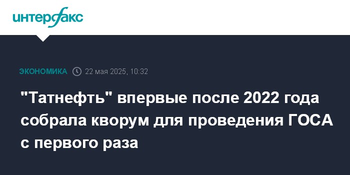 Москва. 22 мая. INTERFAX.RU - "Татнефть" впервые с 2022 года собрала кворум для проведения годового общего собрания акционеров, передает корреспондент "Интерфакса", присутствующий на собрании.