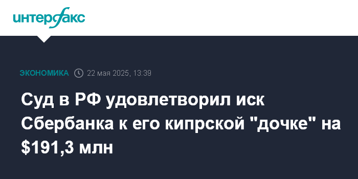 Москва. 22 мая. INTERFAX.RU - Арбитражный суд Москвы в четверг по иску Сбербанка решил взыскать с его кипрской "дочки" - SIB (Cyprus) Limited - $191,3 млн задолженности "по кредитной сделке, заключенной в рамках соглашения об общих условиях проведения двусторонних сделок №105 от 16.09.2011", говорится в информации на сайте суда.