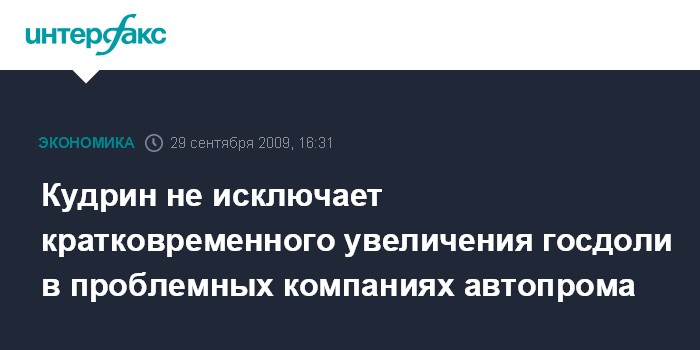 Москва. 29 сентября. INTERFAX.RU - Государство может увеличить долю в проблемных компаниях автопрома и ОПК, заявил журналистам во вторник вице-премьер, министр финансов РФ Алексей Кудрин. "Я не исключаю, что в проблемных компаниях автопромышленного сектора, оборонной промышленности может быть увеличение госдоли", - сказал он. Между тем, отметил глава Минфина, госдоля может повыситься "в краткосрочный период - до двух лет". "Потом опять эти компании будут выведены на рынок и приватизированы", - подчеркнул Кудрин.