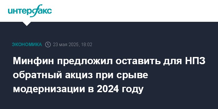 Москва. 23 мая. INTERFAX.RU - Минфин подготовил поправки в Налоговый кодекс (НК) РФ, которые позволят нефтеперерабатывающим заводам (НПЗ) сохранить получение обратного акциза, даже если в 2024 году были допущены срывы сроков модернизации. Об этом сообщил "Интерфаксу" источник, знакомый с подготовкой документа.