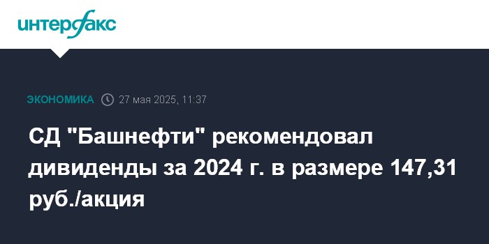 СД "Башнефти" рекомендовал дивиденды за 2024 г. в размере 147,31 руб./акция