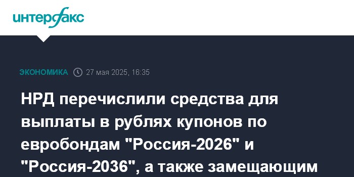 НРД перечислили средства для выплаты в рублях купонов по евробондам "Россия-2026" и "Россия-2036", а также замещающим выпускам