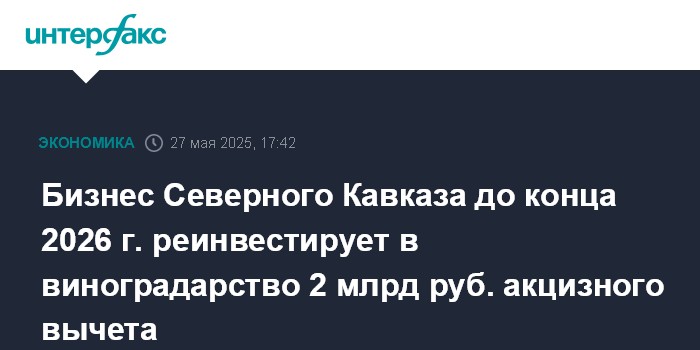 Москва. 27 мая. INTERFAX.RU - Бизнес Северного Кавказа, принимающий участие в эксперименте по реинвестированию части акциза на виноград в его производство, до конца 2026 года направит на эти цели 2 млрд рублей налогового вычета.