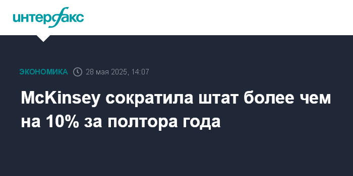 Москва. 28 мая. INTERFAX.RU - Консалтинговая компания McKinsey уволила более 10% сотрудников за последние 18 месяцев в рамках одного из самых масштабных сокращений штата за почти 100-летнюю историю компании.