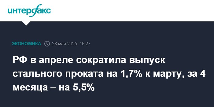 Выпуск нелегированной стали в слитках и полуфабрикатах в прошлом месяце сократился на 5,7% к марту, а к апрелю 2024 года – на 3,8%, составив 4,5 млн тонн. За четыре месяца 2025 года показатель сократился на 2,9% до 18,3 млн тонн.