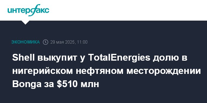Москва. 29 мая. INTERFAX.RU - Британо-нидерландский нефтегазовый гигант Shell купит долю французской TotalEnergies в нефтяном месторождении Bonga у берегов Нигерии за $510 млн, говорится в сообщении Shell.