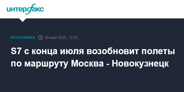 Москва. 29 мая. INTERFAX.RU - Авиакомпания S7 с 22 июля возобновляет полёты по маршруту Москва (Домодедово) - Новокузнецк, сообщил перевозчик.