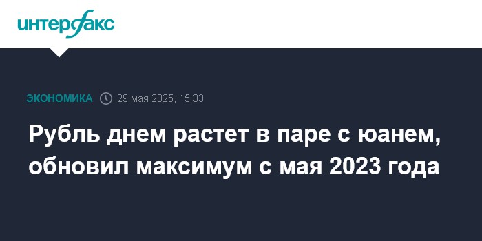 Москва. 29 мая. INTERFAX.RU - Китайский юань дешевеет на Московской бирже днем в четверг. Рубль укрепляется на фоне ожиданий новостей на тему продолжения российско-украинских переговоров, сумел обновить максимум с мая 2023 года. Курс китайской валюты в 15:00 по Москве составил 10,8655 руб., что на 14,8 коп. ниже уровня закрытия предыдущих торгов. Чуть ранее юань падал до 10,84 руб. впервые с 11 мая 2023 года.