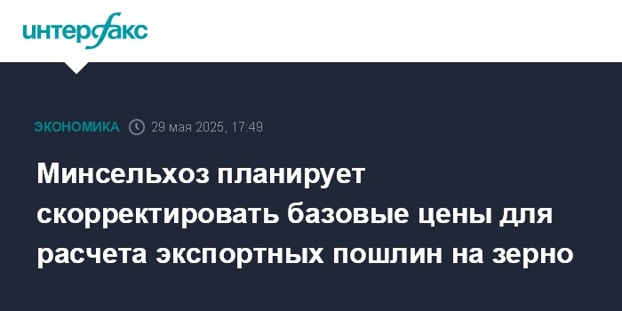 Москва. 29 мая. INTERFAX.RU - Минсельхоз не собирается отказываться от пошлин на экспорт зерна и перед новым сезоном (начинается 1 июля 2025 года) планирует скорректировать базовые цены для их расчета. Об этом сообщил начальник отдела товаропроводящей инфраструктуры департамента регулирования рынков АПК ведомства Сергей Смирнов.