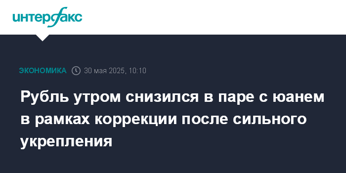 Москва. 30 мая. INTERFAX.RU - Китайский юань вырос на Московской бирже утром в пятницу, рубль опустился в рамках коррекции после сильного роста по итогам предыдущих торгов.