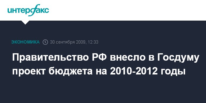 Москва. 30 сентября. INTERFAX.RU - Правительство РФ внесло в Госдуму законопроект "О федеральном бюджете на 2010 год и плановый период 2011 и 2012 годов". Как сообщалось ранее, правительство РФ одобрило проект федерального бюджета на 2010 год и на плановый период 2011 и 2012 гг. на заседании 23 сентября.