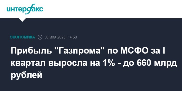 Москва. 30 мая. INTERFAX.RU - Чистая прибыль "Газпрома" по итогам первого квартала 2025 года по МСФО выросла на 1% - до 660 млрд рублей, сообщила компания. Аналитики прогнозировали, что прибыль составит 487 млрд рублей.