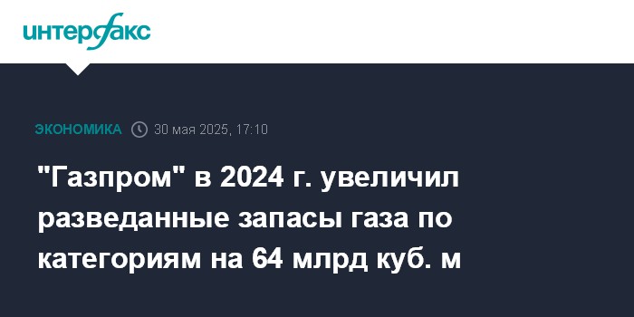 Москва. 30 мая. INTERFAX.RU - "Газпром" в 2024 году увеличил запасы газа по категориям А+В1+С1 (разведанные) по российской классификации на 64,4 млрд куб. м (0,23%) - до 27,8 трлн кубометров, говорится в отчете эмитента.