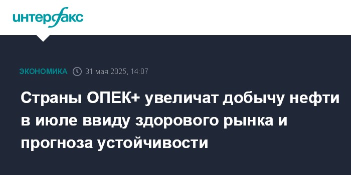 Москва. 31 мая. INTERFAX.RU - Восемь стран ОПЕК+ договорились о третьем подряд ускоренном увеличении добычи нефти на 411 тыс. баррелей в сутки ввиду прогноза устойчивости мировых экономик и текущих сильных рыночных факторов, что отражено в низких коммерческих запасах нефти, говорится в пресс-релизе ОПЕК по итогам заседания.