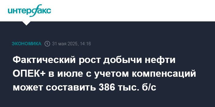 Фактический рост добычи нефти ОПЕК+ в июле с учетом компенсаций может составить 386 тыс. б/с