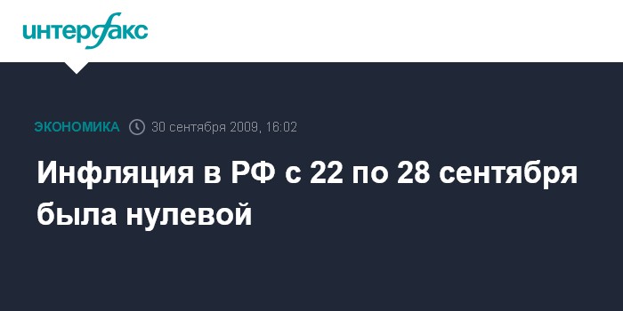 Москва. 30 сентября. INTERFAX.RU - Потребительские цены в РФ с 22 по 28 сентября не изменились, сообщил Росстат в среду. Цены в РФ из-за сезонного удешевления плодоовощной продукции не растут уже шестую неделю подряд, в том числе инфляция была нулевая в последние четыре недели: на неделях с 15 по 21, с 8 по 14 и с 1 по 7 сентября цены не изменялись, с 25 по 31 августа цены снизились на 0,1%, с 18 по 24 августа - не изменились.