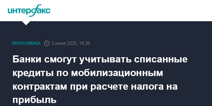 Москва. 3 июня. INTERFAX.RU - Правительство поддержало законопроект, позволяющий кредитным организациям учитывать при расчете налога на прибыль все суммы прощенных обязательств по кредитам, прекращенным в связи с мобилизацией или участием заемщика в боевых действиях.