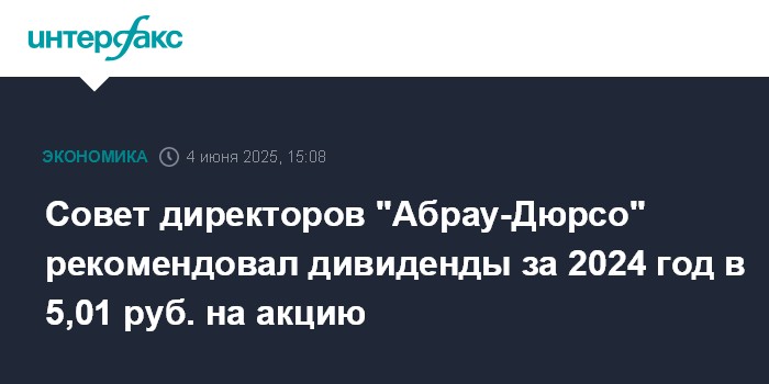 Москва. 4 июня. INTERFAX.RU - Совет директоров компании "Абрау-Дюрсо", ведущего производителя игристых вин в РФ, рекомендовал дивиденды за 2024 год в 5,01 рубля на акцию, сообщает компания.