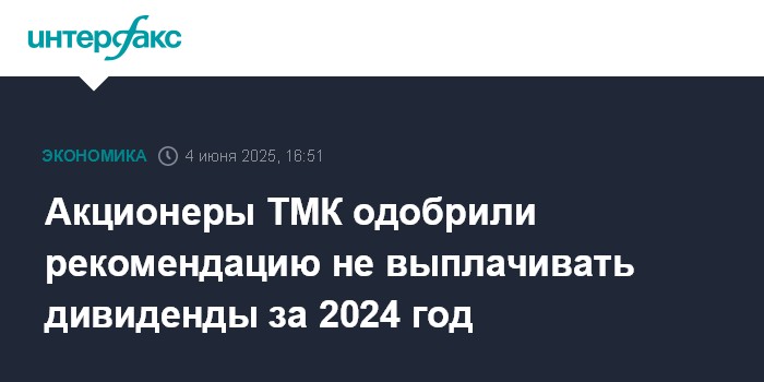 Москва. 4 июня. INTERFAX.RU - Акционеры "Трубной металлургической компании" (ТМК) на годовом собрании, которое состоялось 4 июня, одобрили рекомендацию совета директоров не выплачивать дивиденды за 2024 год, сообщила компания.