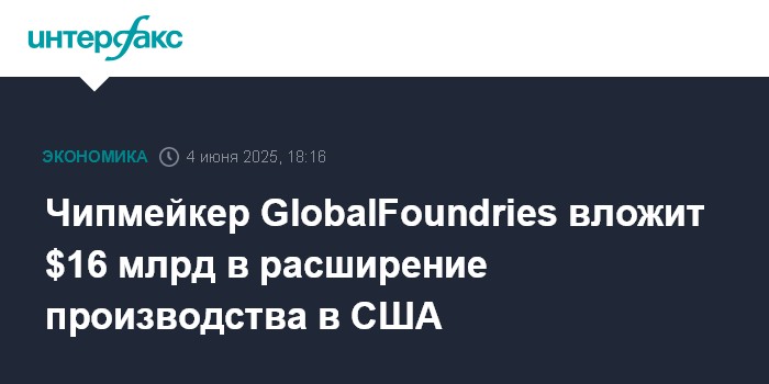 Москва. 4 июня. INTERFAX.RU - GlobalFoundries Inc., крупнейший в США производитель чипов на заказ, объявил об инвестициях в размере $16 млрд в наращивание производства внутри страны.