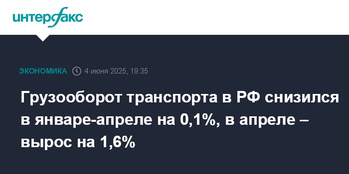 Москва. 4 июня. INTERFAX.RU - Грузооборот транспорта в РФ снизился в январе-апреле 2025 года по сравнению с тем же периодом прошлого года на 0,1% и составил 1 трлн 872,1 млрд т-км. Об этом сообщается в материалах Федеральной службы государственной статистики (Росстат).