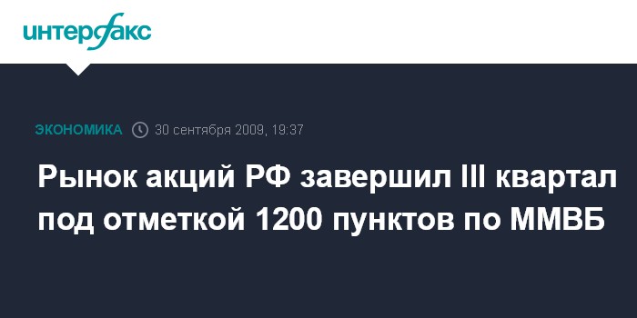 Москва. 30 сентября. INTERFAX.RU - Рынок акций РФ завершил III квартал под отметкой 1200 пунктов по индексу ММВБ - на последних в сентябре торгах рынок ушел в "минус" на слабых данных о деловой активности в США; неплохая статистика по ВВП США за второй квартал не уберегла рынки от продаж.
