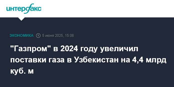 Москва. 5 июня. INTERFAX.RU - "Газпром" в 2024 году поставил в Узбекистан 5,64 млрд кубометров газа по сравнению с 1,28 млрд куб. м в 2023 году, говорится в годовом отчете компании.