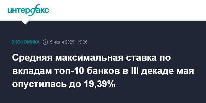 Москва. 5 июня. INTERFAX.RU - В третьей декаде мая 2025 года среднее арифметическое значение максимальных процентных ставок по вкладам в рублях (без учета вкладов с дополнительными условиями) десяти российских банков, привлекающих наибольший объем депозитов физлиц, снизилось до 19,39% с 19,52% во второй декаде, сообщает сайт Банка России.