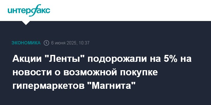 Москва. 6 июня. INTERFAX.RU - В начале основных торгов на "Московской бирже" акции ритейлера "Лента" подорожали на 5%, до 1548 рублей за штуку, на новости о том, что "Лента" может купить гипермаркеты сети "Магнит".